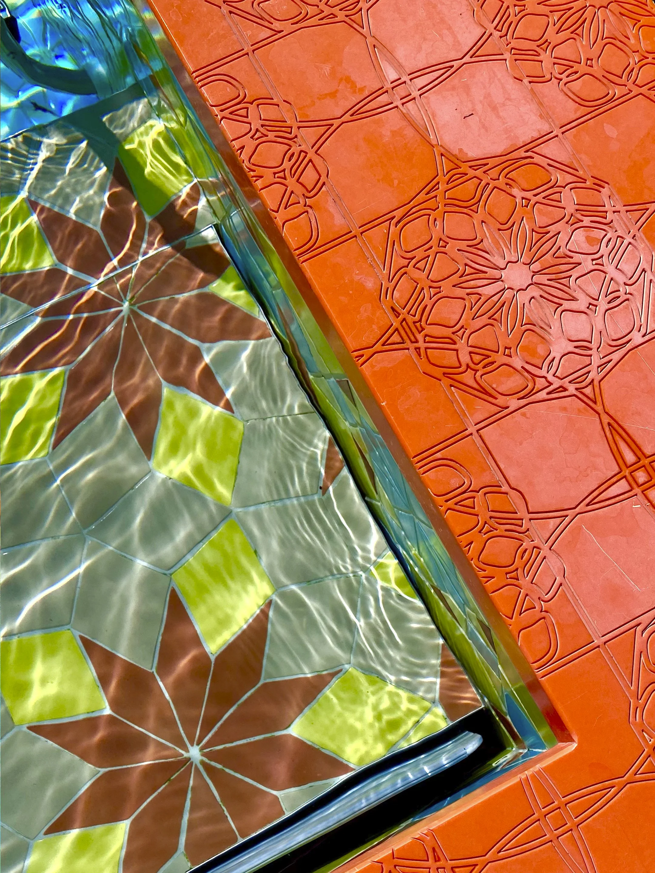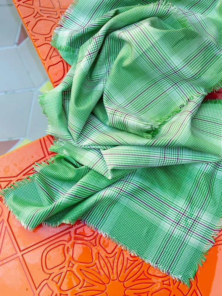 Groen, geel en zachtroze grijpen in elkaar in een grafisch weefsel — als de lente in een ritmisch patroon.